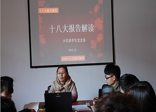 2012年12月7日中午,计信系党总支书记杨军老师对各班的团支书进行了培训。她将十八大精神的理解总结为:“一个主体,两大目标,三个层次,四个亮点,五个一体”。通过共同学习,各班团支书对“十八大精神”有了更深刻的认识,并纷纷表示要把自己对于十八的学习和理解带到班中去宣讲。