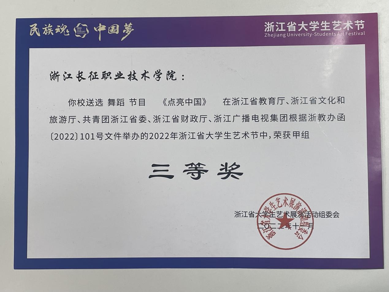 在2022年浙江省大学生艺术节中,由我校人文与教育学院选送的舞蹈节目《万疆》荣获甲组二等奖、舞蹈节目《点亮中国》荣获甲组三等奖的好成绩。