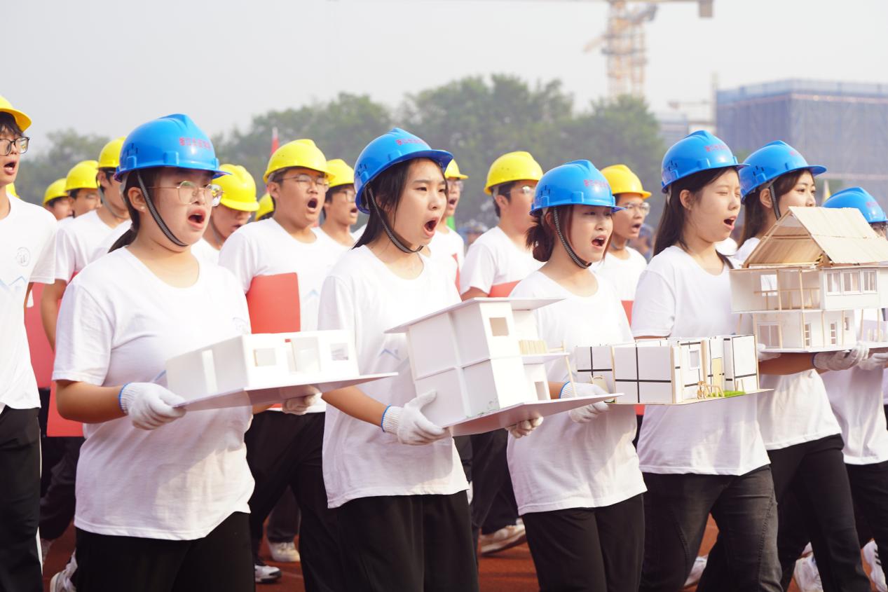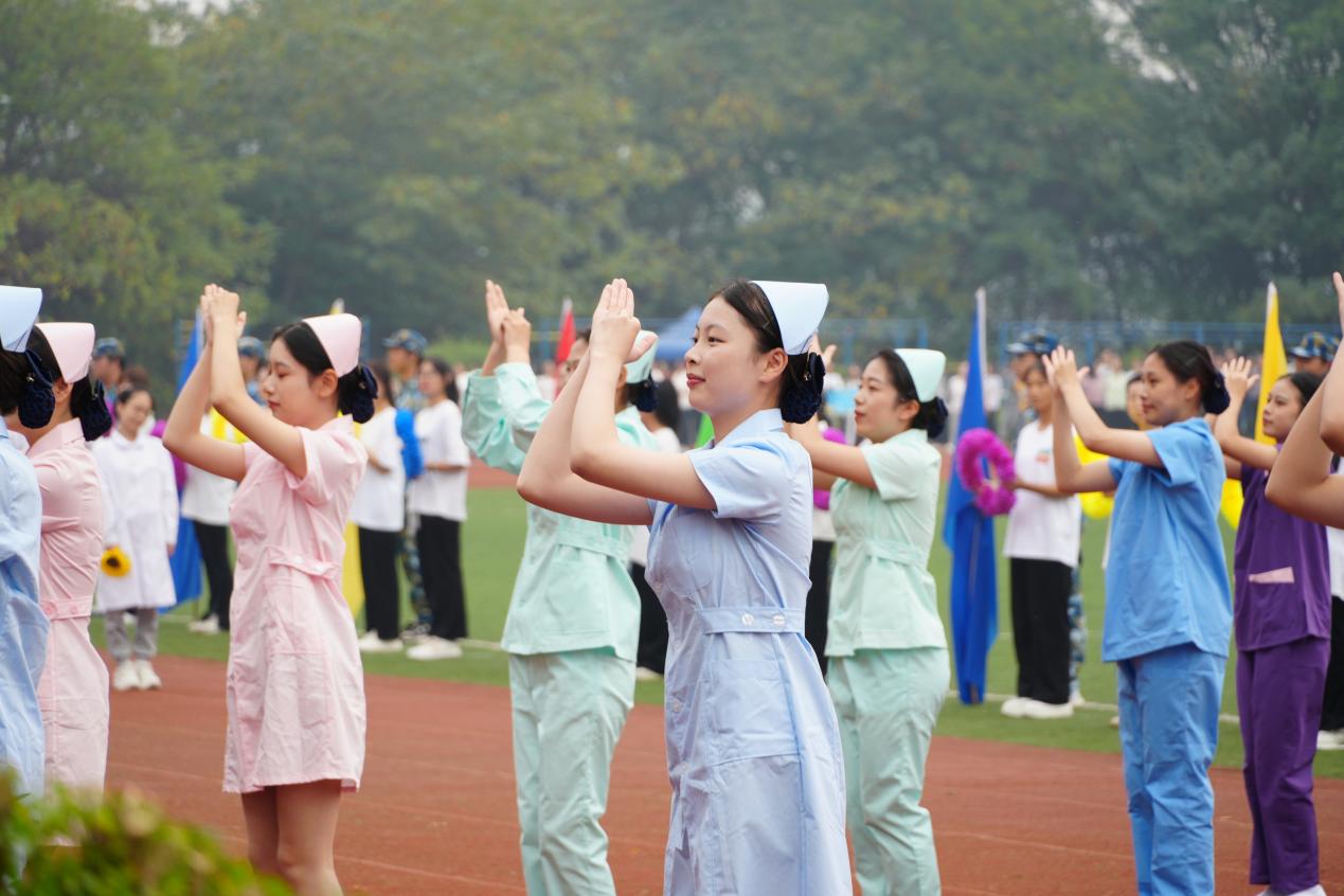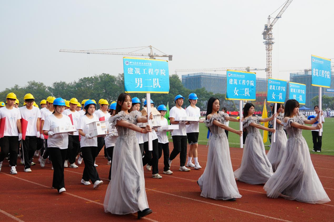 雄姿英发,气势昂扬,开幕式的序幕随着国旗护卫队铿锵有力的步伐郑重拉开。五颜六色的彩旗方阵迎风招展,绚丽多彩的花环方阵青春飞扬;裁判员方阵彰显专业素养,本着为运动员和赛事服务的宗旨,全心全意为运动会保驾护航。各二级学院方阵更是别出新意,百花齐放,他们身着运动服装,举着别具特色的道具,喊着嘹亮的口号,依次入场,表演精彩尽显专业学科特色,口号嘹亮展现长征青年风貌。计算机与信息技术学院方阵模拟键盘打字的按键上下起舞,创意十足;护理与健康学院的洗手舞展现了学生们的专业素养和精神风貌,时而腾空而起、时而摇头摆尾的舞狮展示了学生们的青春活力和积极向上;建筑工程学院的建模充分展现了学院学科特色。各方阵队伍各具特色的精彩表演彰显了长征学子在新时代潮头奋发向上的精神面貌,赢得在场观众的阵阵喝彩与掌声。