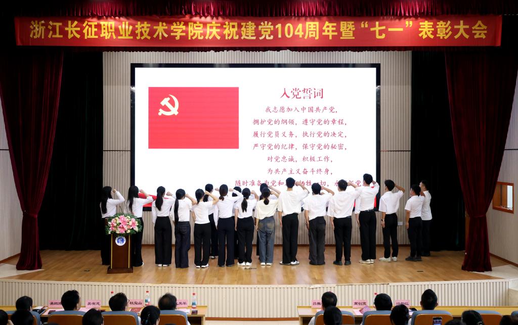在新党员宣誓环节,19名新党员代表进行了入党宣誓仪式。仪式结束后,管理学院23空中乘务班祁佳莹同学作为新党员代表上台发言,她表示将牢记党的教诲,努力学习,积极工作,为党和人民的事业贡献自己的力量。