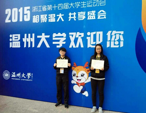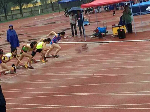 浙江长征职业技术学院代表团由杜宝山副院长任团长。在体育教研室曹桂霞、王海霞两位教练员的严格训练与认真指导下,从我院田径健儿中选拔出6位优秀运动员参加此次比赛。比赛期间一直下着雨,但我院运动员不畏风雨,顽强拼搏,赛出了风格,赛出了水平。经过5天激烈的竞争,获得了骄人的成绩:陈莉倩同学获得女子跳高第二名,以1.52米的成绩打破了省大运会女子跳高赛会记录;沈盼同学获得女子100米栏第三名和三级跳远第五名; 陈琪同学获得女子400米第六名; 倪秀婷同学获得女子400米第四名和800米第八名,同时,陈莉倩、徐扬两位同学还被大会评为“优秀运动员”。