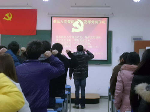最后,全体党员面对党旗举起右手在吴少俊老师领誓下进行了庄严的宣誓。这次活动的开展进一步强化了党员的先进意识、宗旨意识、责任意识、和光荣意识。必将促进党员在平时的工作、学习、生活中起先锋模范作用,树立良好形象。