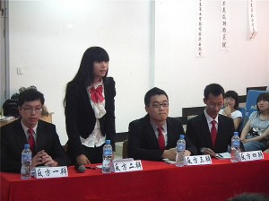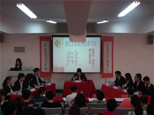 10报关一班代表队和10建筑管理班代表队经过近三周的激烈角逐从十一支队伍中脱颖而出。双方围绕“大学生道德素质的提高主要依靠自律还是他律”展开巅峰对决。双方辩手你来我往,各抒己见,一问一答,一论一辩,据理力争,或避其锋芒,攻其漏洞,或主动出击,层层相扣。不论是“开篇立论”,还是“攻辩”环节,他们都是妙语连珠、犀利陈词。在最激动人心的“自由辩论”阶段中,10建筑管理班的四位辩手表现得尤其出色,他们充分利用团队合作精神,以清晰的逻辑、严谨的论证和自信从容的发言,赢得了在场观众的阵阵掌声和热烈喝彩。